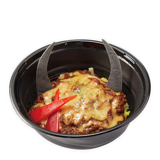 オロニル族の衣装をイメージした黄色、食べ応えのある挽き肉 カレー、太陽をイメージしたトマト。族長であるマグナイをイメー ジした黒い角と武器イメージのチーズをトッピングしました。